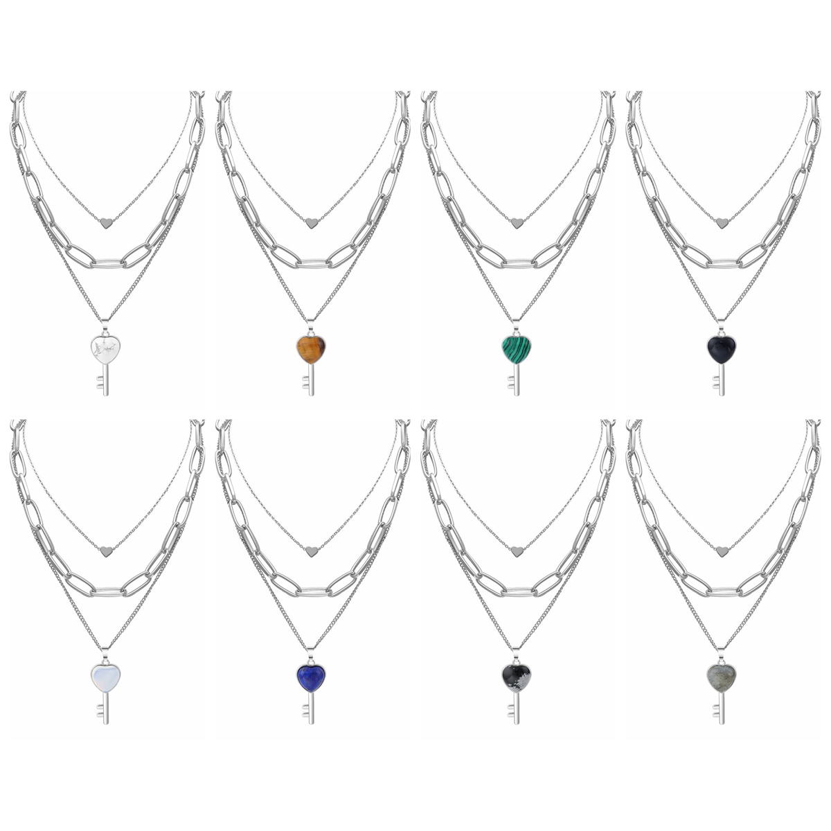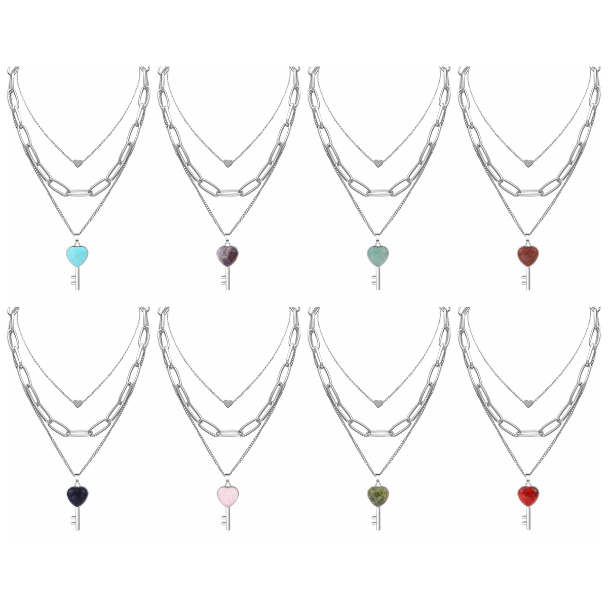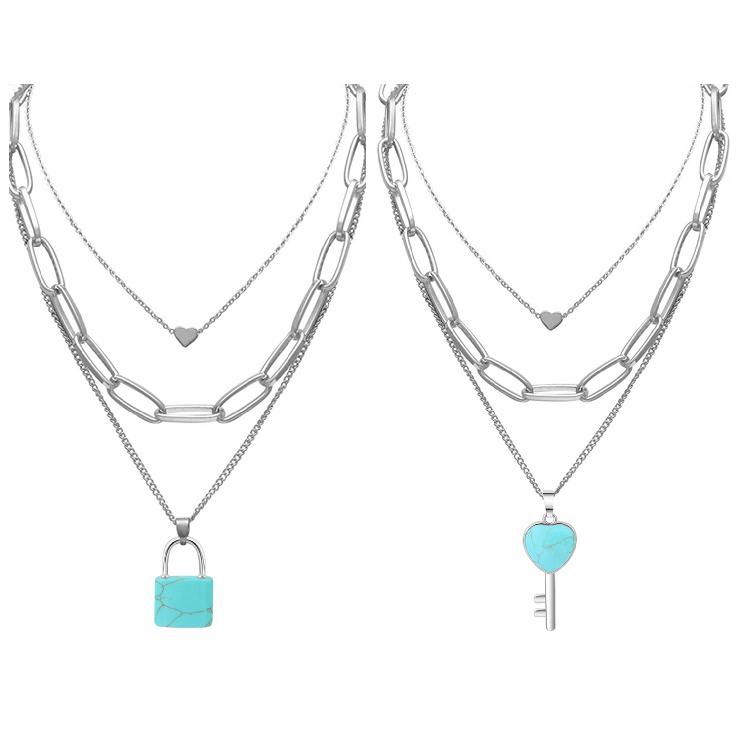 Couple Layered Chain Necklace Natural Gemstone Key and Lock Pendant Choker Jewelry for Women Men